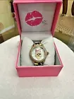 Betsey Johnson Gold Tone Multi Skull Face Crystal Bezel Watch-New in Box